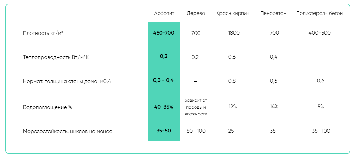 Как видно из данных в таблице, теплоэффективность арболита, гораздо выше других материалов.